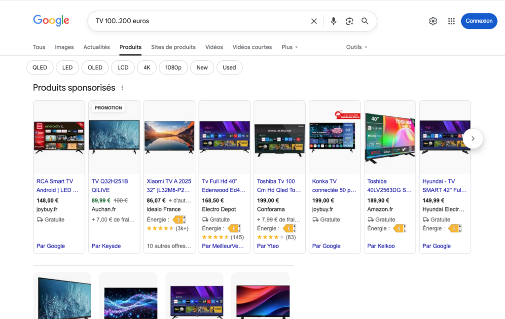 Google affiche les résultats liés à des télévisions d’une valeur comprise entre 100 et 200 euros.