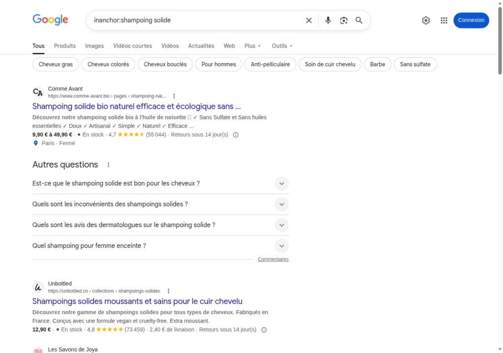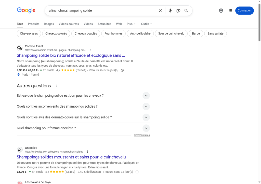 En sourcing de liens, c’est un moyen rapide d’identifier les sites qui captent des backlinks optimisés sur une thématique. Je l’utilise régulièrement pour repérer les profils de liens de mes concurrents avant de passer sur Ahrefs | Babbar \ SEObserver pour creuser.