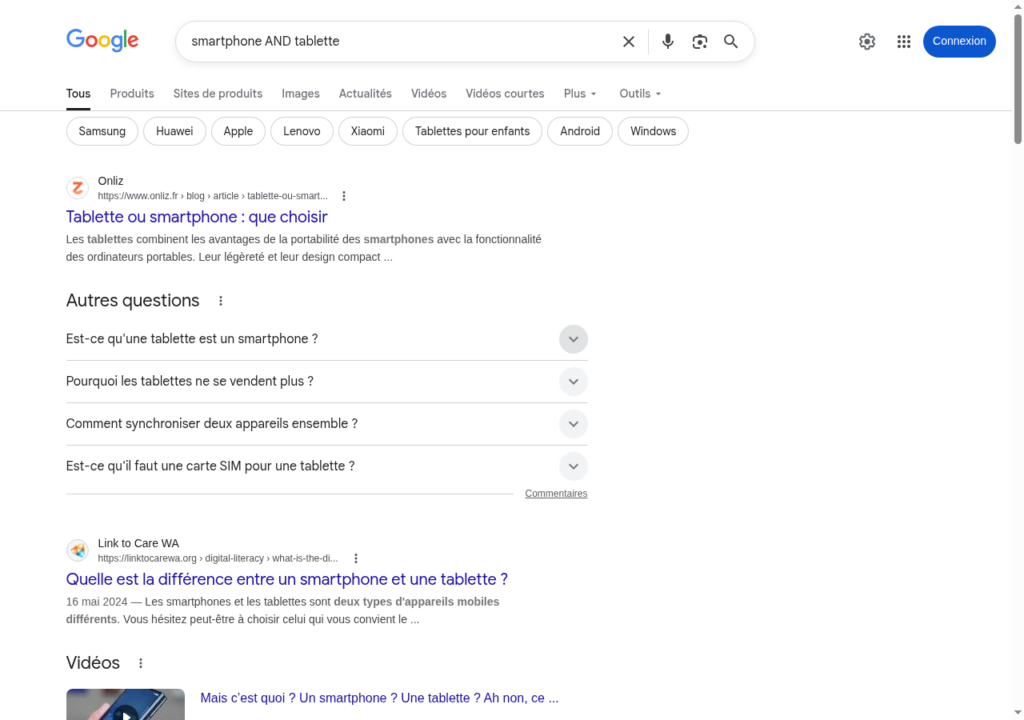 Exemple :smartphone AND tablette