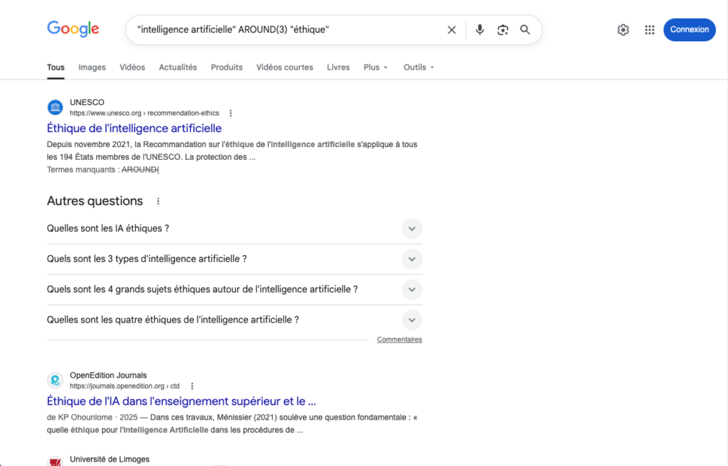 Exemple :"intelligence artificielle" AROUND(3) "éthique"