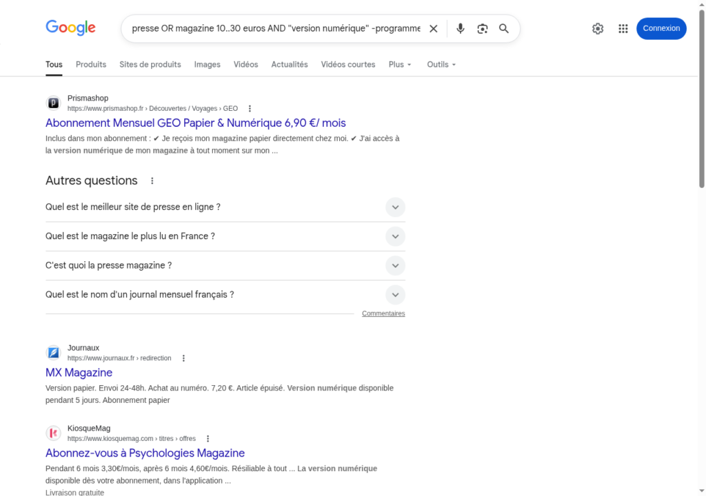 Prenons un cas concret : rechercher une presse ou un magazine, entre 10 et 30 euros, comportant la formulation « version numérique », sans le mot « programme ».