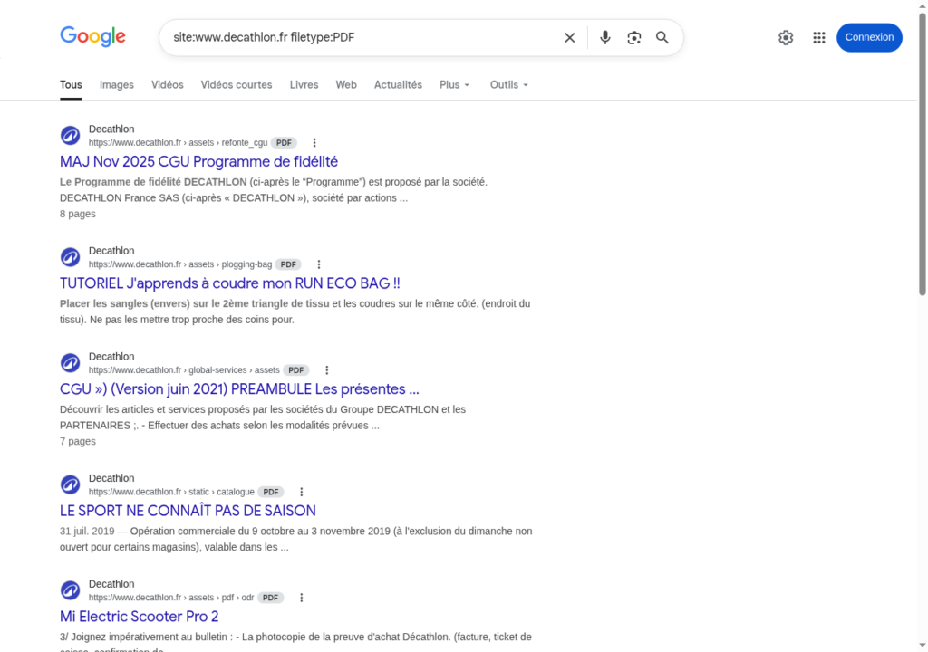 Exemple :site:www.decathlon.fr filetype:PDF