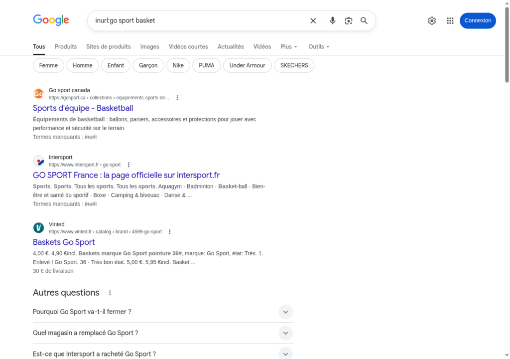 Exemple :allinurl:go sport basket