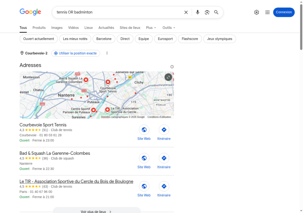 Exemple :tennis OR badminton