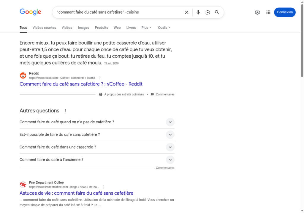 Exemple :"comment faire du café sans cafetière" -cuisine