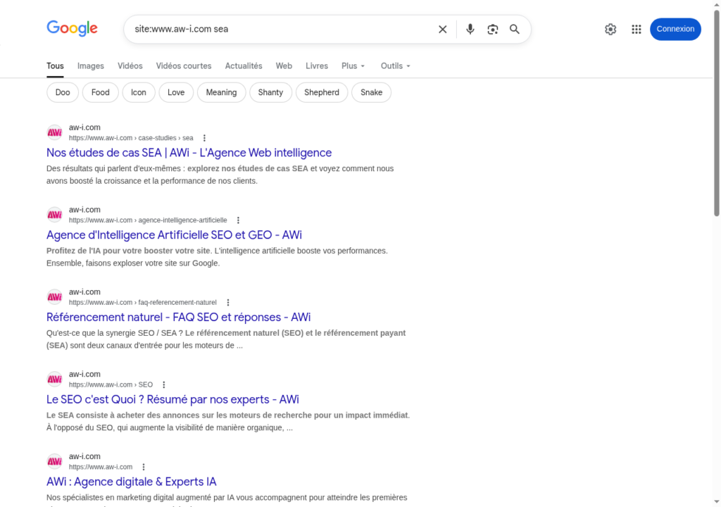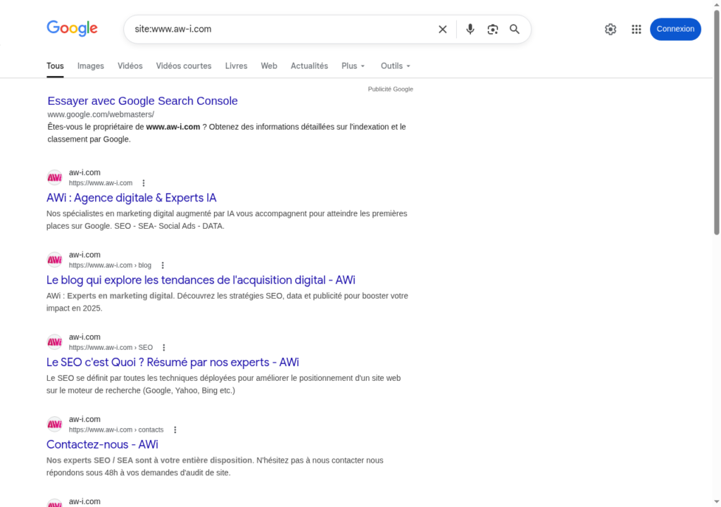 Google affiche l’ensemble des pages du site AWi référencées dans son index. Associé à un mot clé, il fait ressortir toutes les pages d’un site traitant d’un sujet donné :