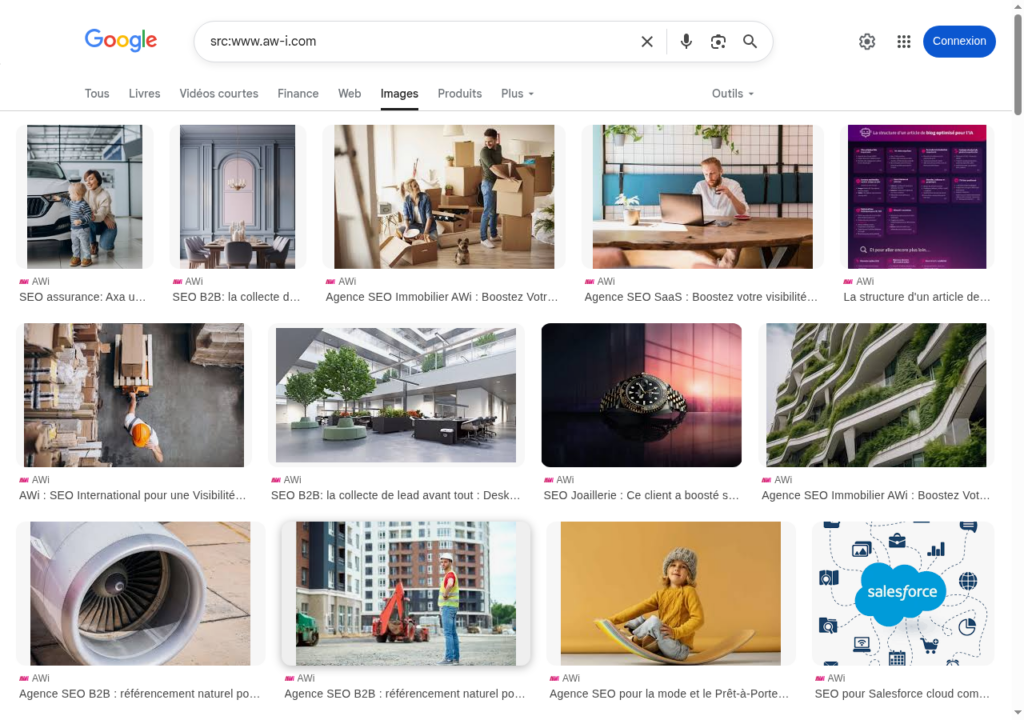 Google Images affiche toutes les images associées au domaine www.aw-i.com.